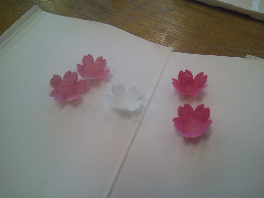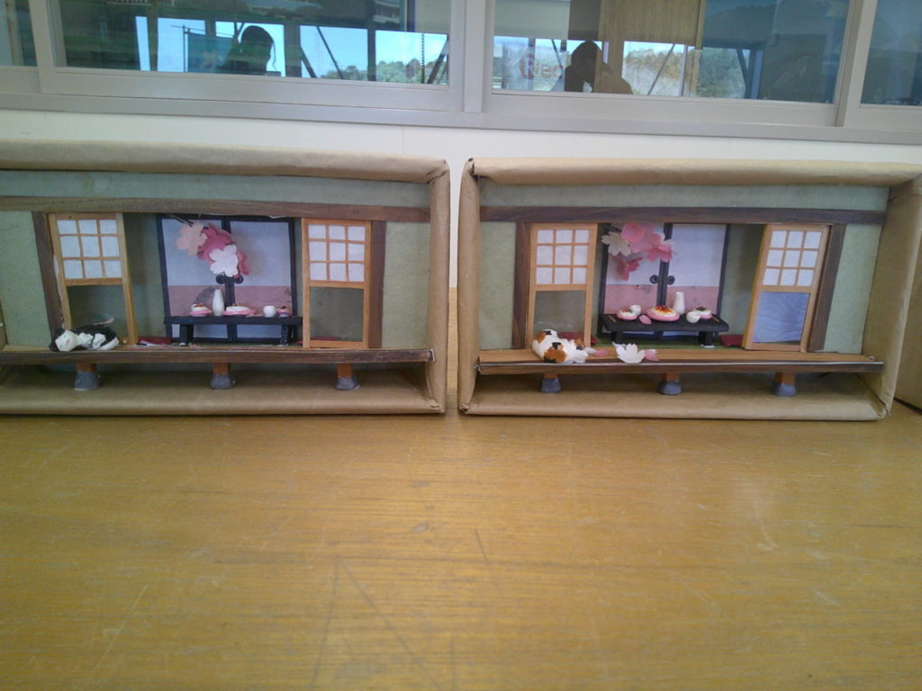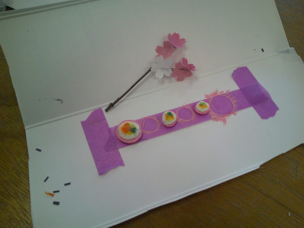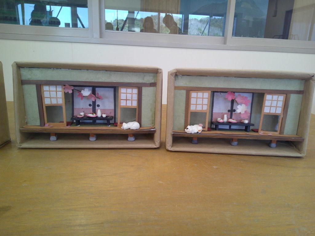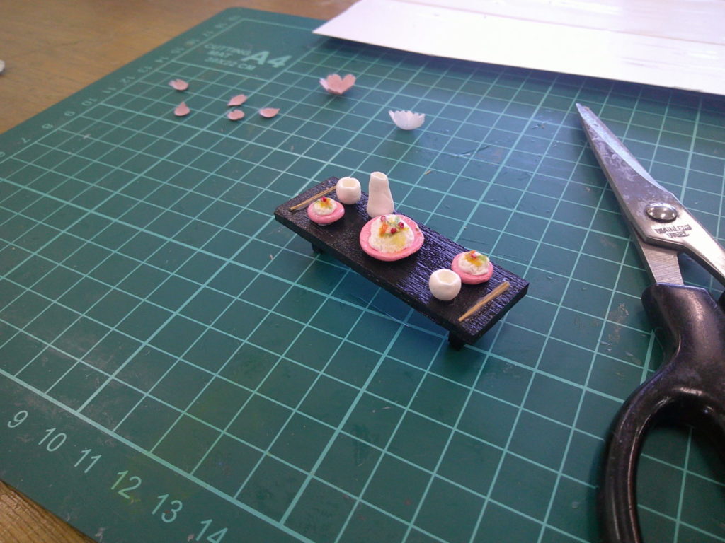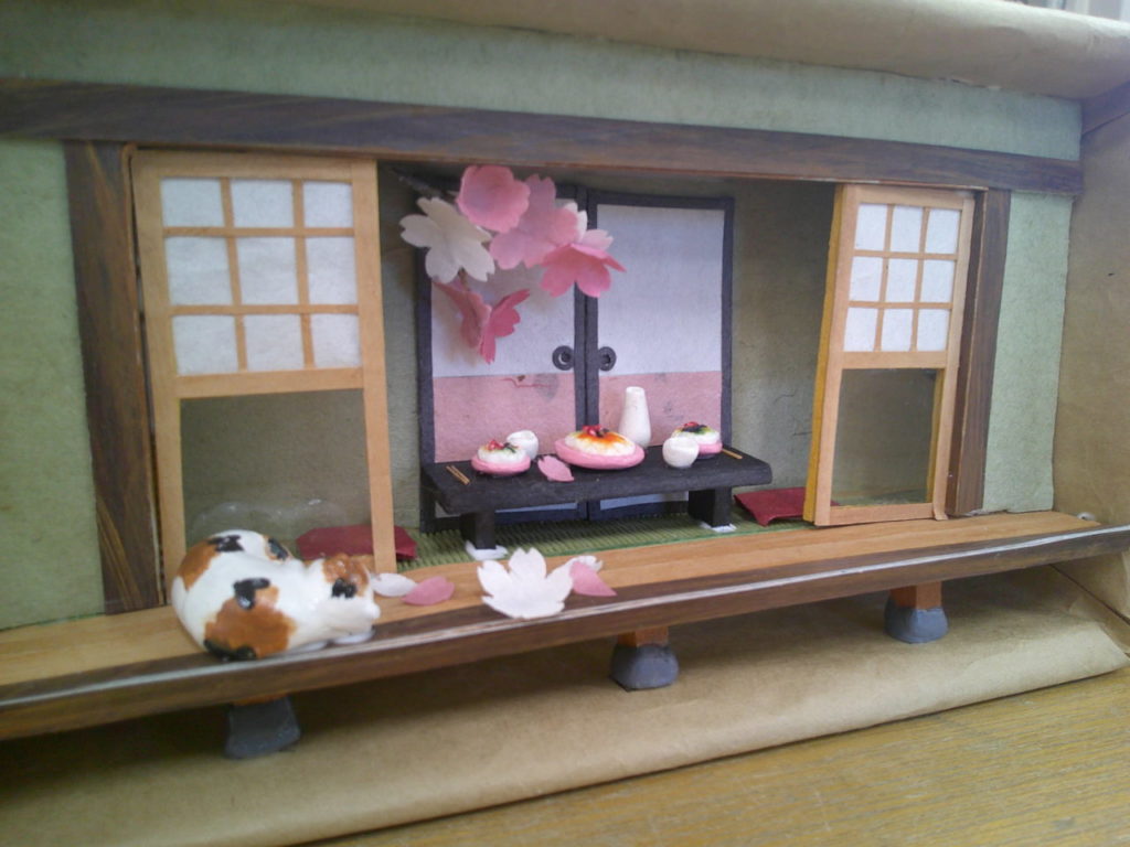 『縁側でお花見』、3か月で一つの作品をつくりあげる講座の3回目です。今回は、ちらし寿司、桜の枝、桜の花びら、ハウスの仕上げをおこない完成です。